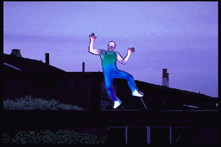 #1 Falling Man (25k gif), life size, Forton MG, steel, neon, 1995, sited at Socrates Sculpture Park, Long Island City, NY. $22,000 - A negative body cast lit by hidden neon tubes on the edge. As the volume is filled with multi-colored light, the eerie, holographic style image projects backwards and then forward depending on the inclination of the viewer- a distinct light sculpture discovery by Kraft.